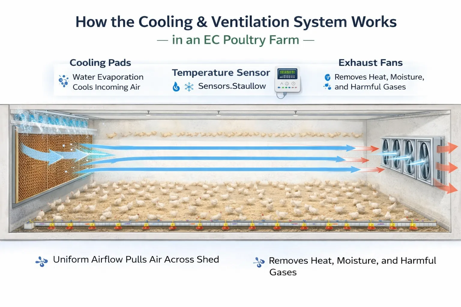 This creates a controlled environment (EC shed) that keeps birds comfortable, healthy, and stress-free with minimal manual intervention.
