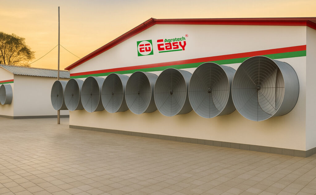 The exhaust system operates through high-capacity galvanized fans (box or cone type) installed along the poultry shed walls. These fans create a negative pressure inside the shed, drawing out hot, stale air and maintaining optimal air circulation.
